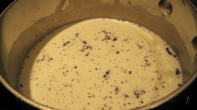 Over medium heat bring the milk/cream mixture to a boil. Slowly pour 1/3 of the hot milk into the egg mixture, whisking constantly. Add the warmed egg mixture to the mixture in the saucepan and continue to cook over low heat