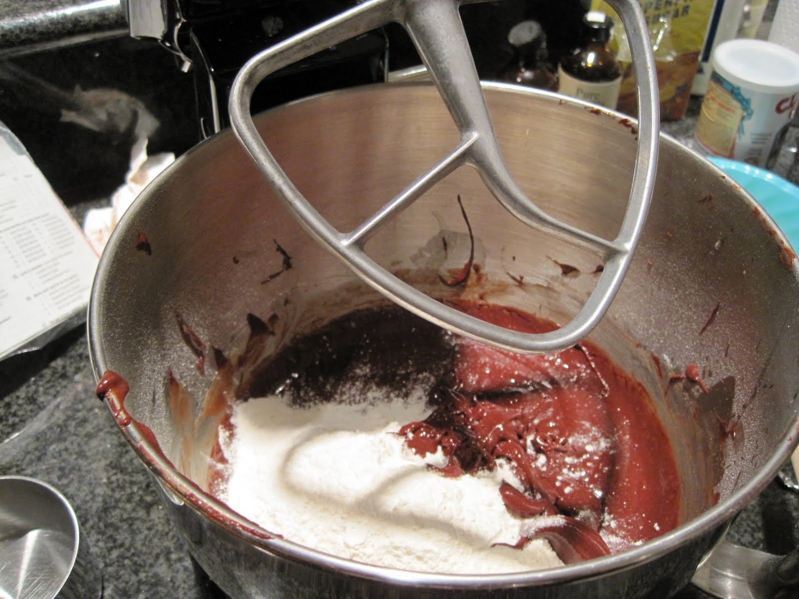Change to the paddle attachement and reduce the mixer speed to low. Gradually add the flour mixture.