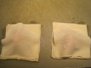 Place wontons on a smooth surface. You will need 2 wontons to make a single Chocolate Raspberry Wonton Heart.