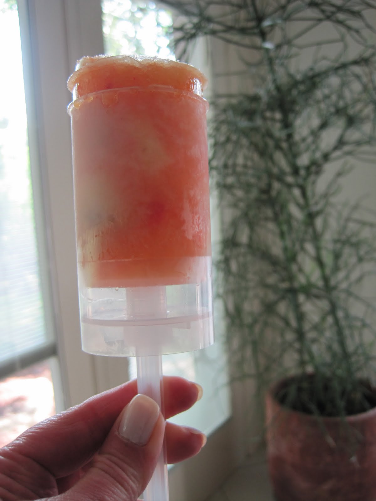 To make the push pops I simply reserved some of the mixture and poured it into the push pop containers and covered them with the lids they come with. Then pop in the freezer for 24 hours, standing up in a glass or like I did – propped up between the slats of my freezer shelves.