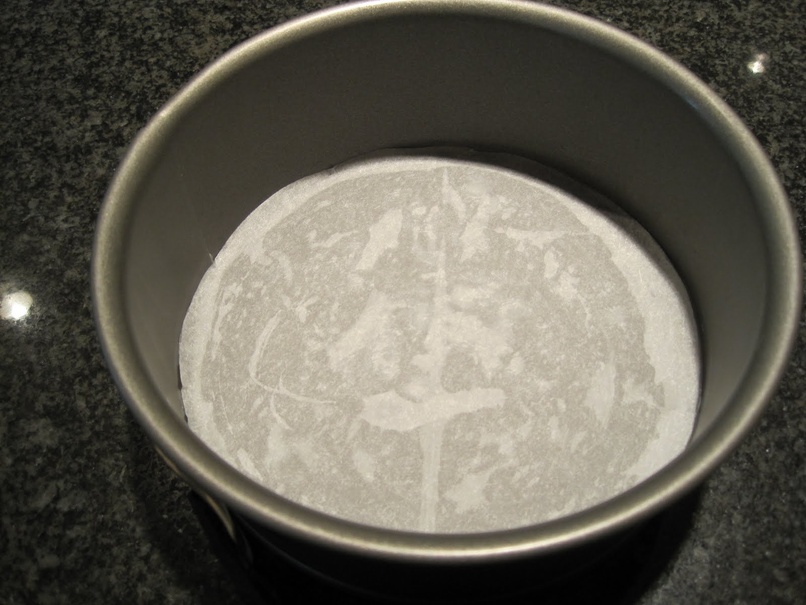 Lightly grease a 6 inch springform pan (I used a 7 inch), with 1/2 teaspoon butter, and place parchment paper on top. Break each of the biscuits into almond-size pieces by hand and set aside.