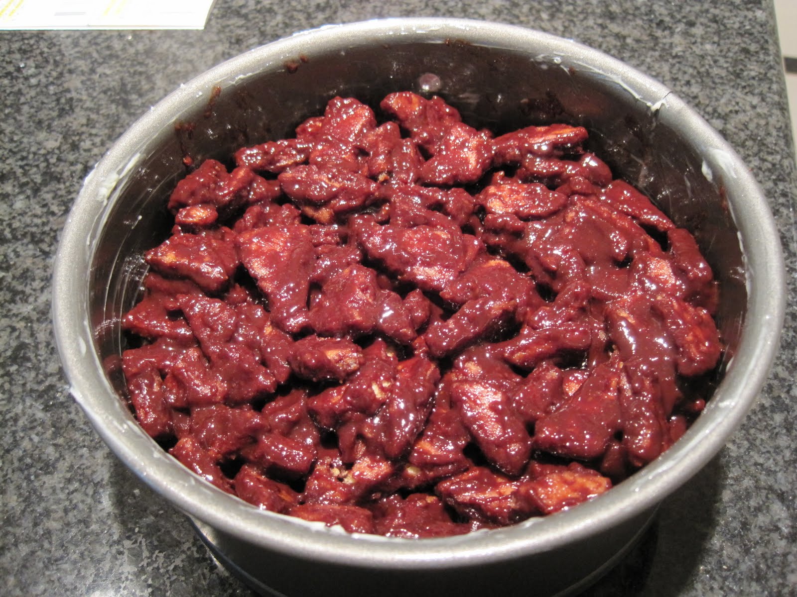 Spoon the chocolate biscuit mixture into the prepared springform pan. Try to fill all of the gaps on the bottom of the pan, because this will be the top when it is unmolded. Chill the cake in the refrigerator for at least 3 hours.