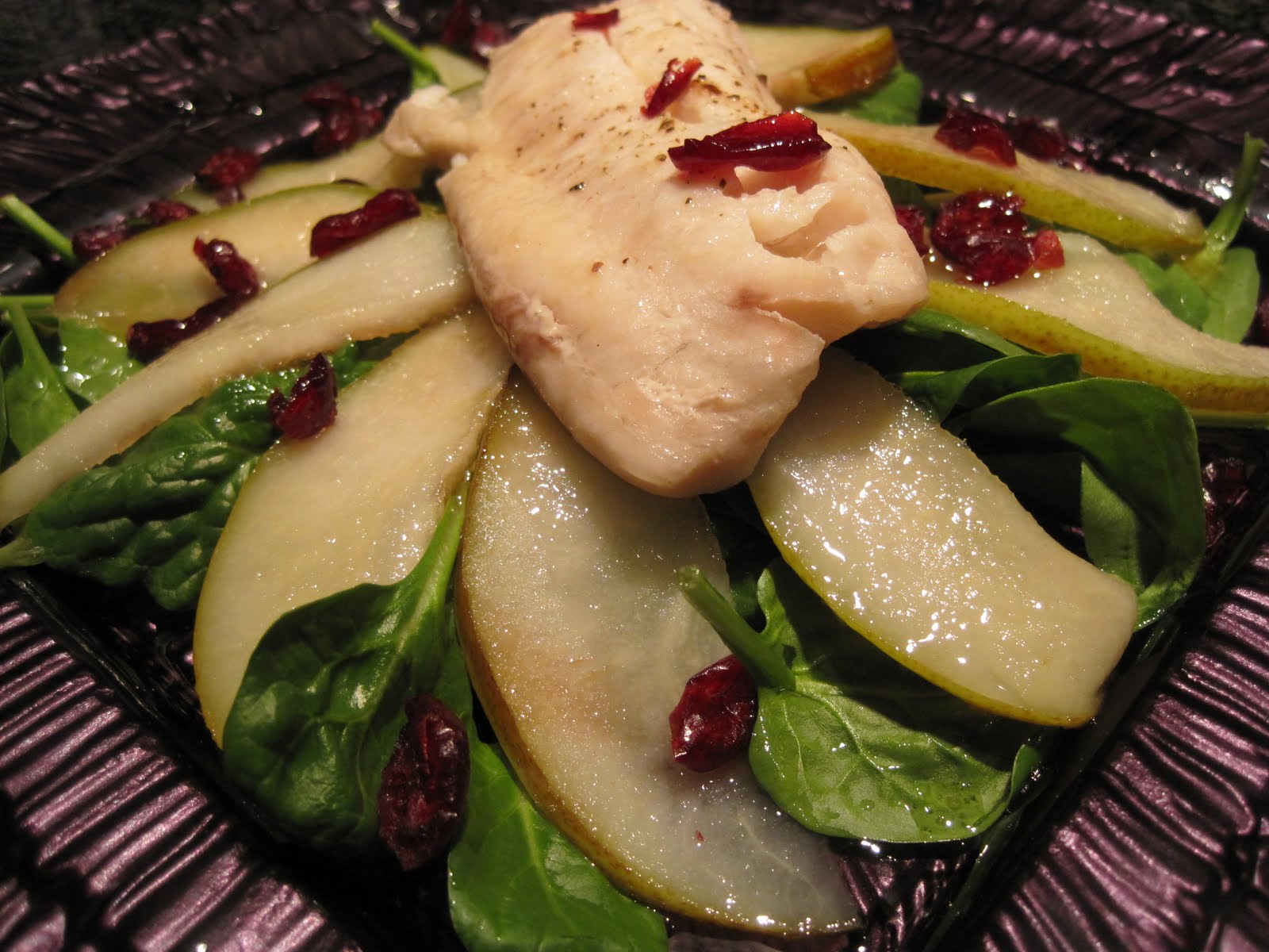 Place ingredients desired for your salad on a plate, then lay the pear slices neatly around the spinach. Top with Tilapia, fish of choice or chicken.