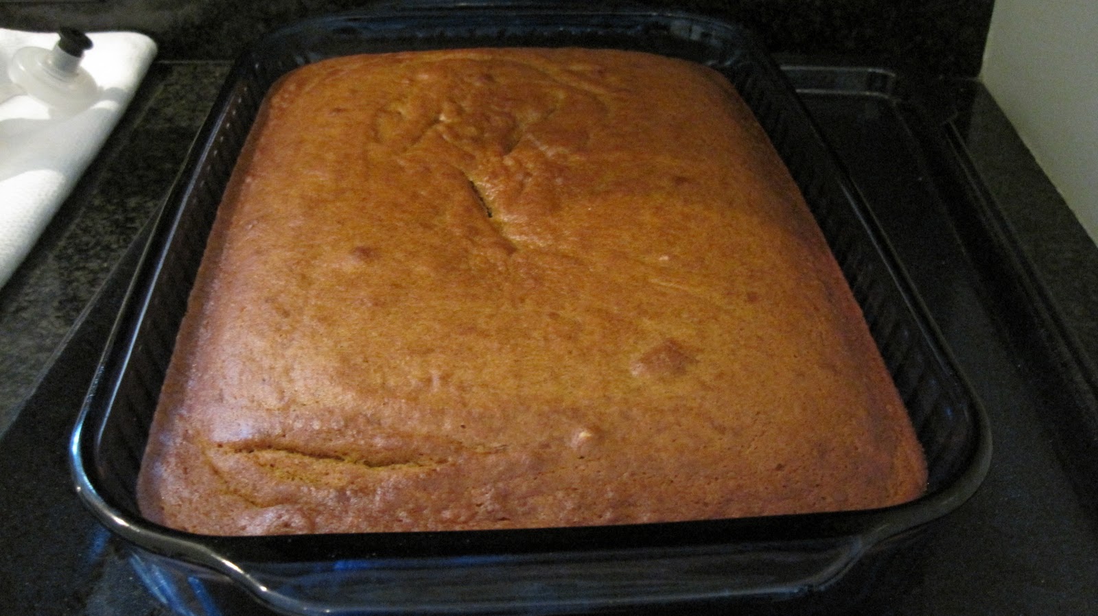 - Pour into a greased 15-in. x 10-in. x 1-in. baking pan. Bake at 350° for 20-25 minutes or until a toothpick inserted near the center comes out clean. Cool in pan on a wire rack.