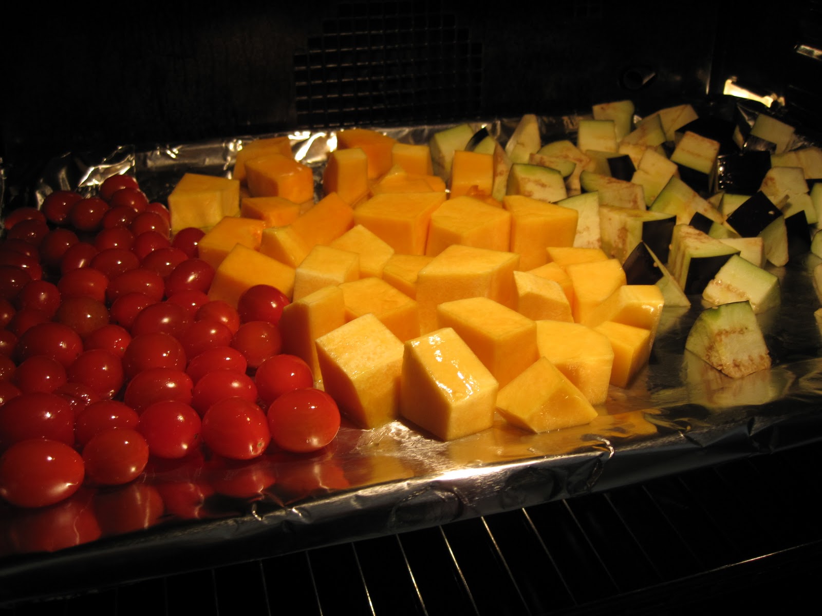 In the meantime, while the quinoa was cooking I washed the tomatoes, butternut squash and eggplant. I cut the squash and eggplant into cubes and placed all 3 vegetables together, mixed with some olive oil on a foil lined cooking sheet. I then placed the vegetables into a 450F degree oven for about 20 minutes or until all were tender, then drizzled the veggies with a chiffonade of basil. I cooked my vegetables on convention/bake, so if you are just baking it would probably take closer to 30 minutes.