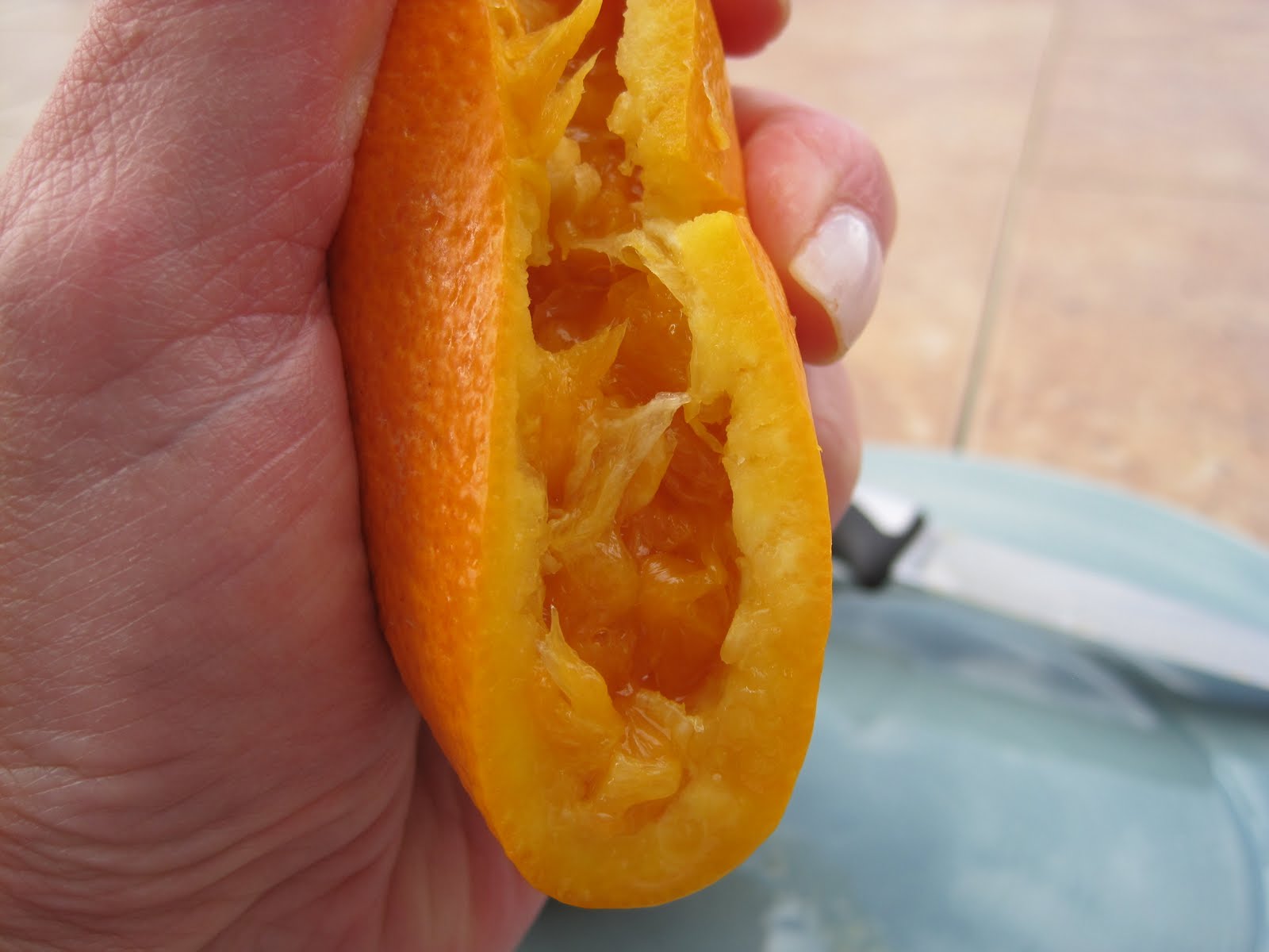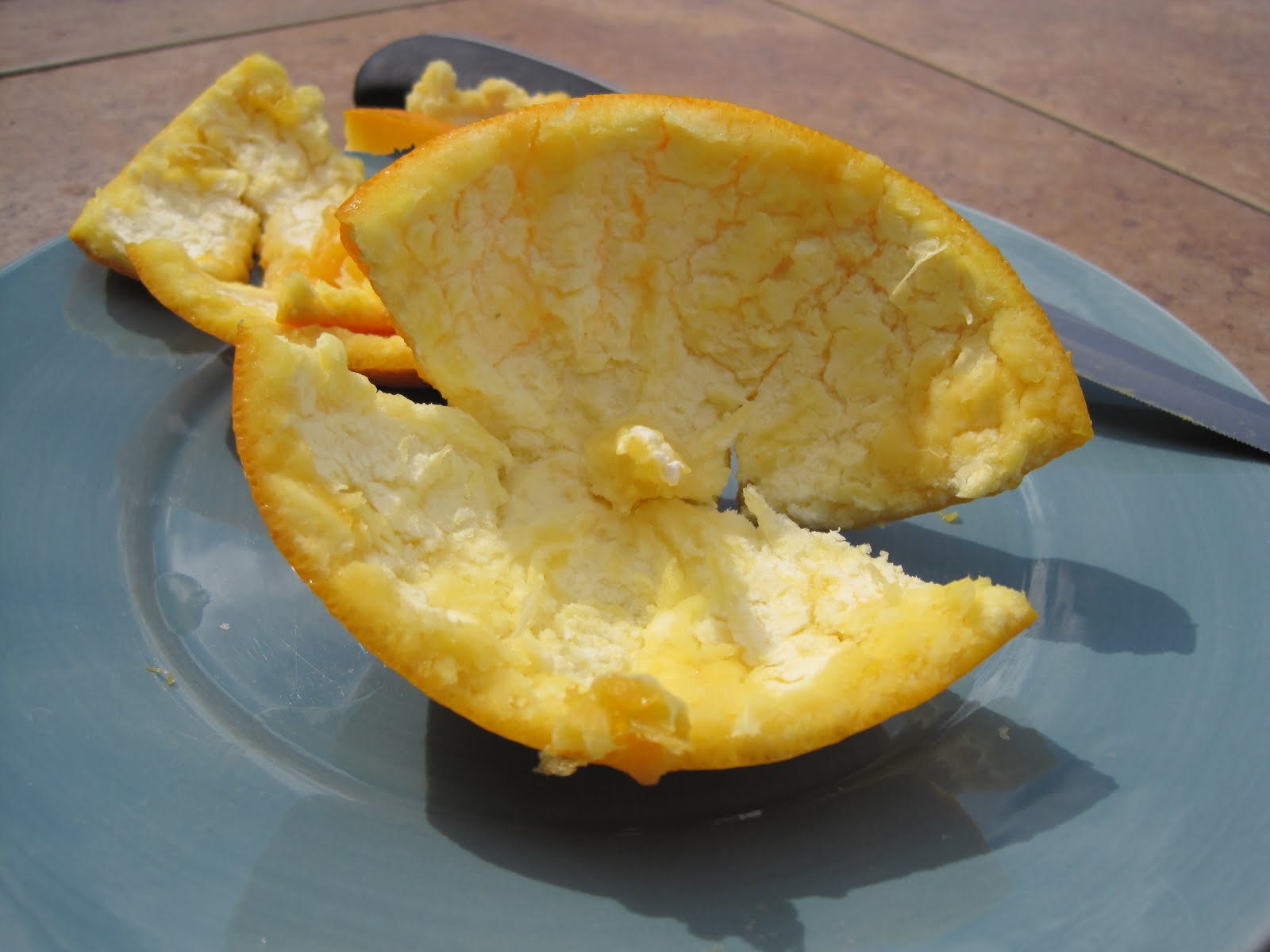 That’s not it, there’s still more? Now turn the orange inside out, so the remaining meat is arched outward.